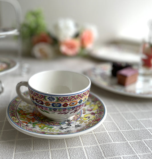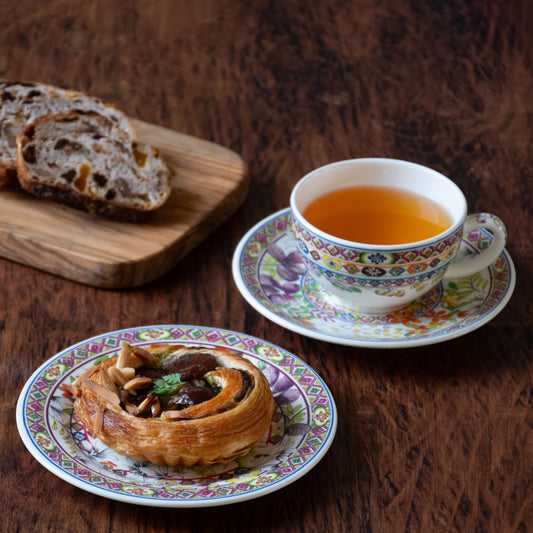 デニッシュを盛り付けたプレートは異国情緒を感じさせる幾何学的な文様と花のコントラストが斬新なジアン/GIENのバガテルシリーズ。