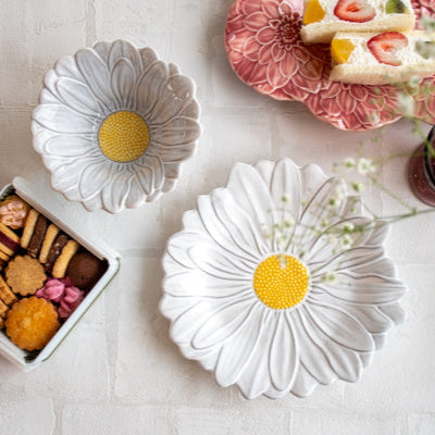 可愛いデザインが特徴のデイジーのプレートは、少しグレーがかったアンティークなカラー。華やかな中にも落ち着いた雰囲気が演出できます。今回はグリーンと合わせて明るいガーデンシーンをイメージ。お友達と会話が弾むガーデンパーティーをしませんか。