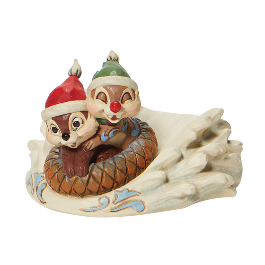 チップとデールの兄弟がドングリのヘタのソリに乗って雪山を滑り降りています。
