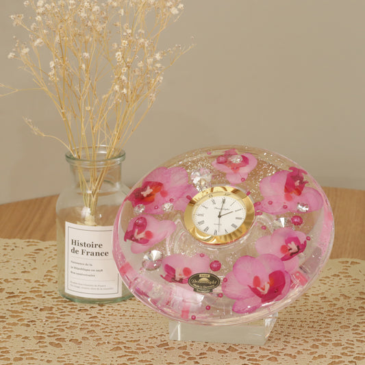 愛らしいピンクの花々を、まるで花束のように詰め込んだ置き時計。