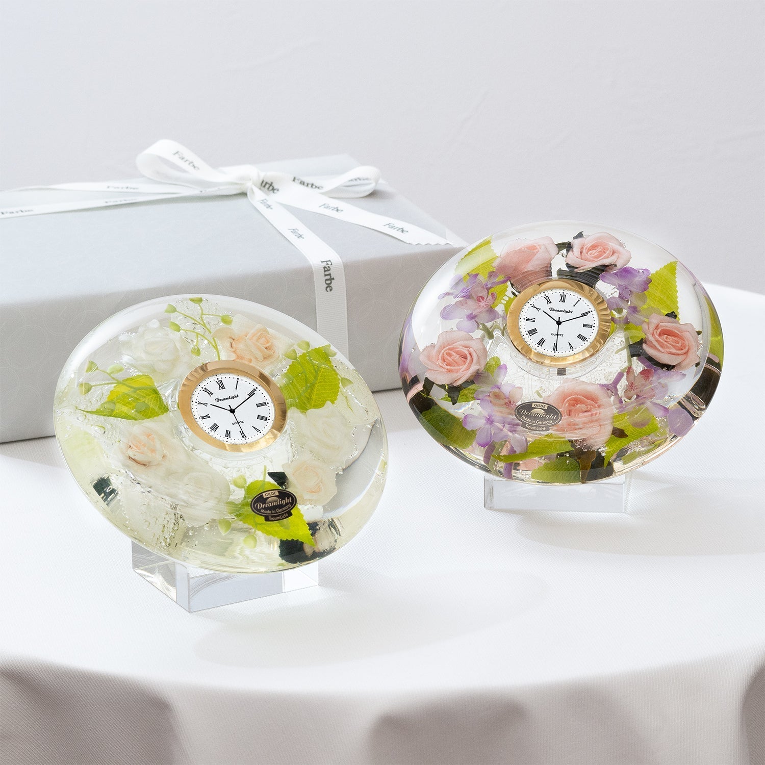 ガラスの器にお花を閉じ込めたみずみずしいデザインで、新鮮さと華やかな雰囲気を感じられるドリームクロックプレミアムシリーズ。