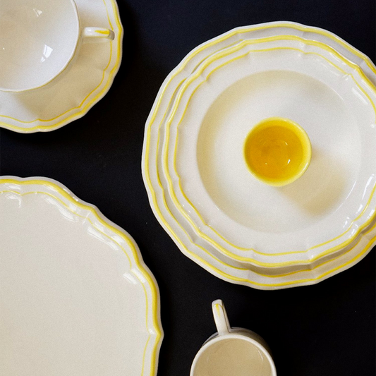 手描きの縁取りに、レモンのような明るい黄色が映える、上品かつ軽やかなデザイン。
