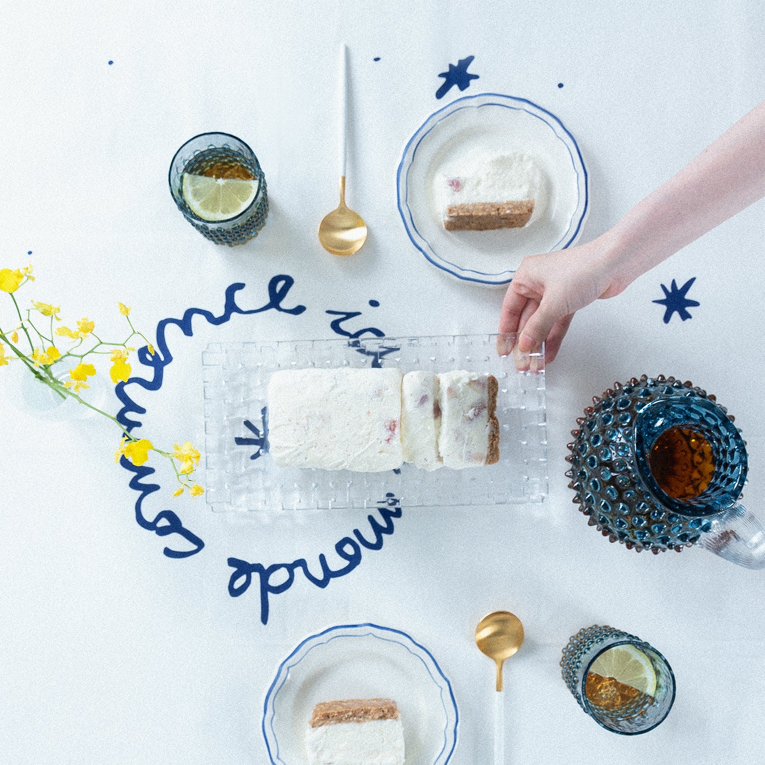 シリーズのテキストデザインがグラフィカルに入ったコットン100%のテーブルクロスです。