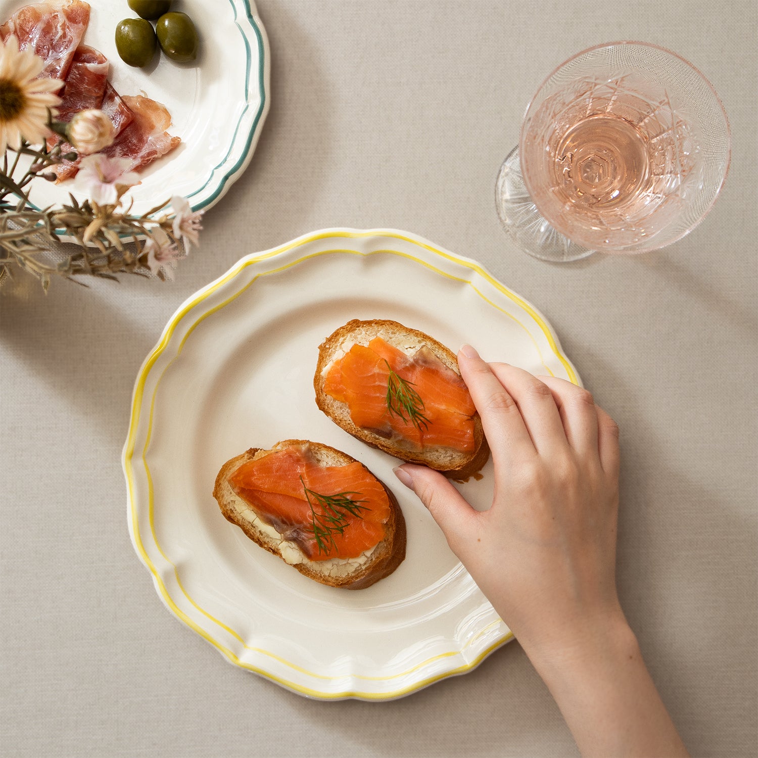 現代のテーブルウェアにもぴったりと合ったフォルムとハンドペイントで施された柔らかなカラーラインが特徴です。
