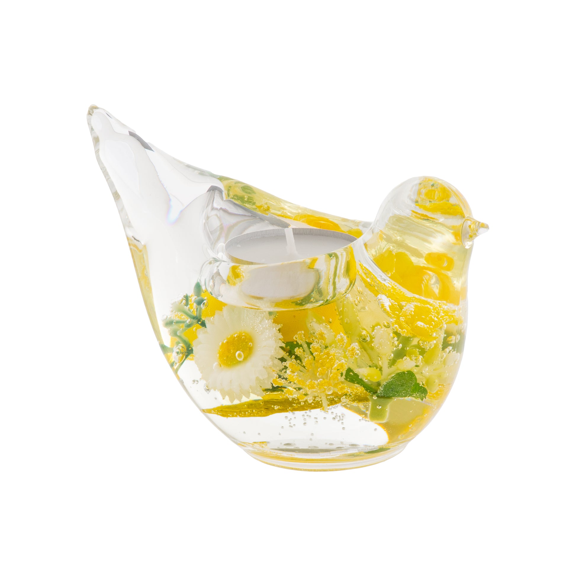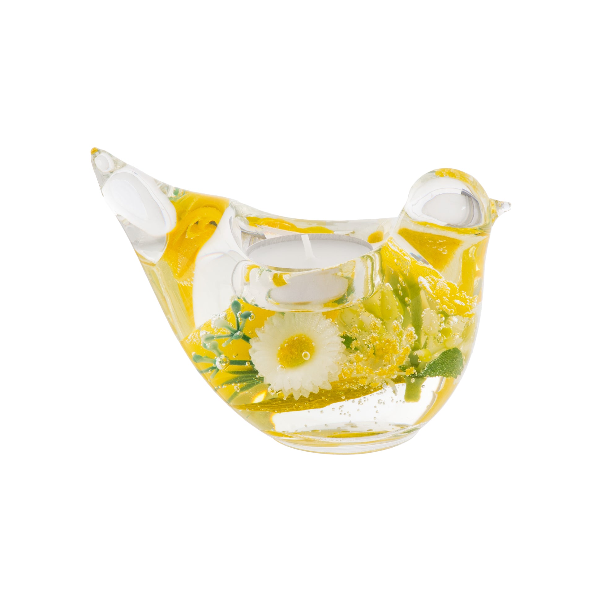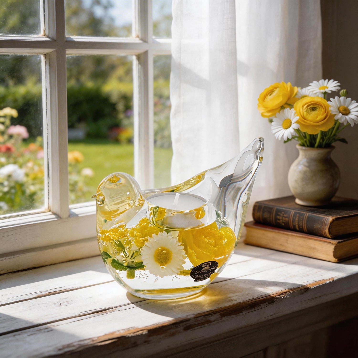 マウスブロウで丁寧に形づくられたガラスの器に、彩り豊かな花々やビーズのモチーフをジェルで封じ込めた、みずみずしいデザインが特徴です。