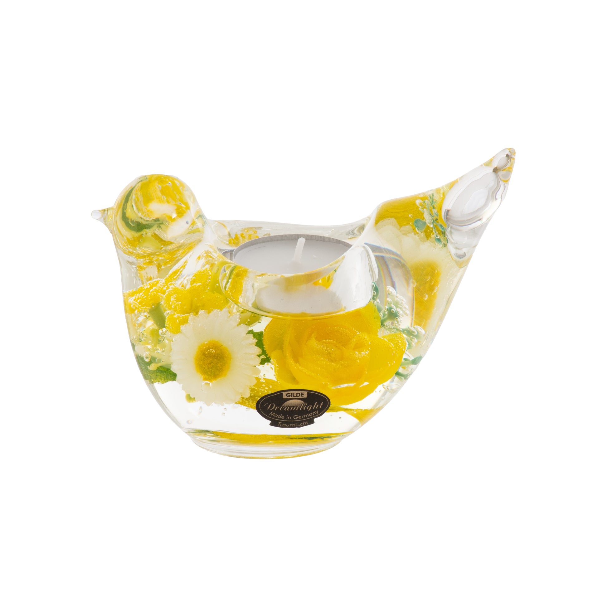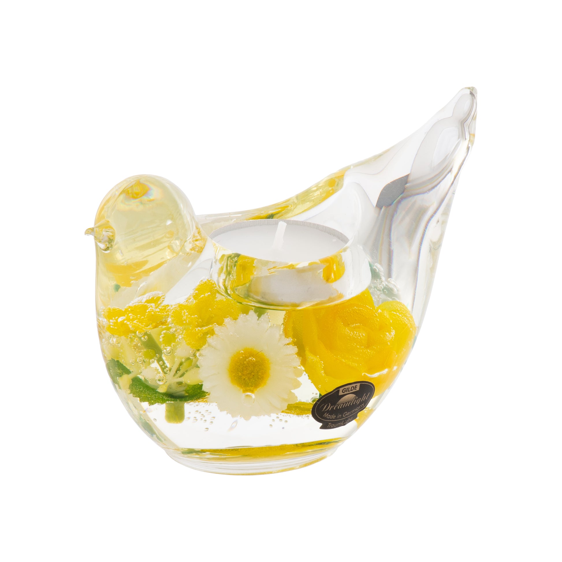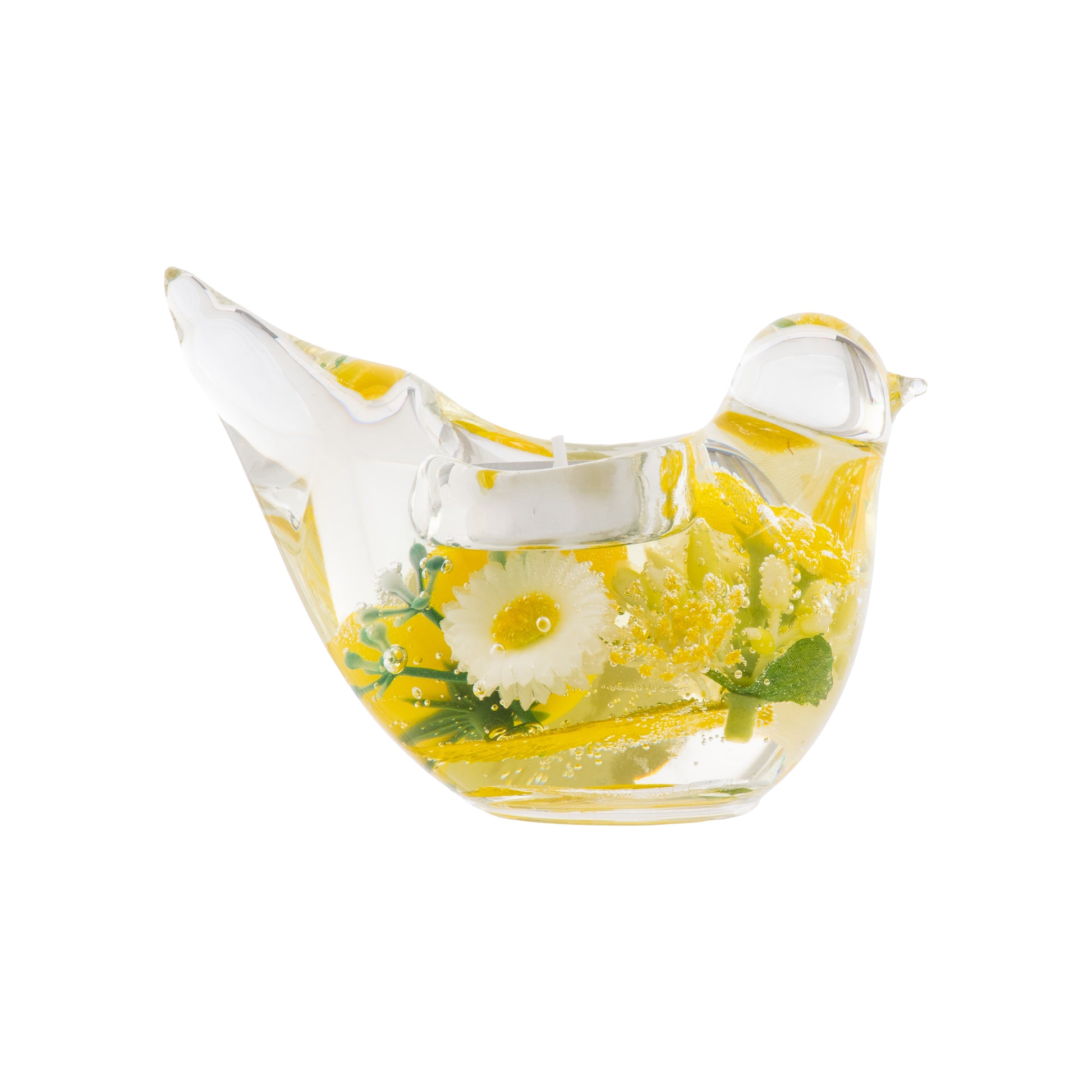 マウスブロウで丁寧に形づくられたガラスの器に、彩り豊かな花々やビーズのモチーフをジェルで封じ込めた、みずみずしいデザインが特徴です。