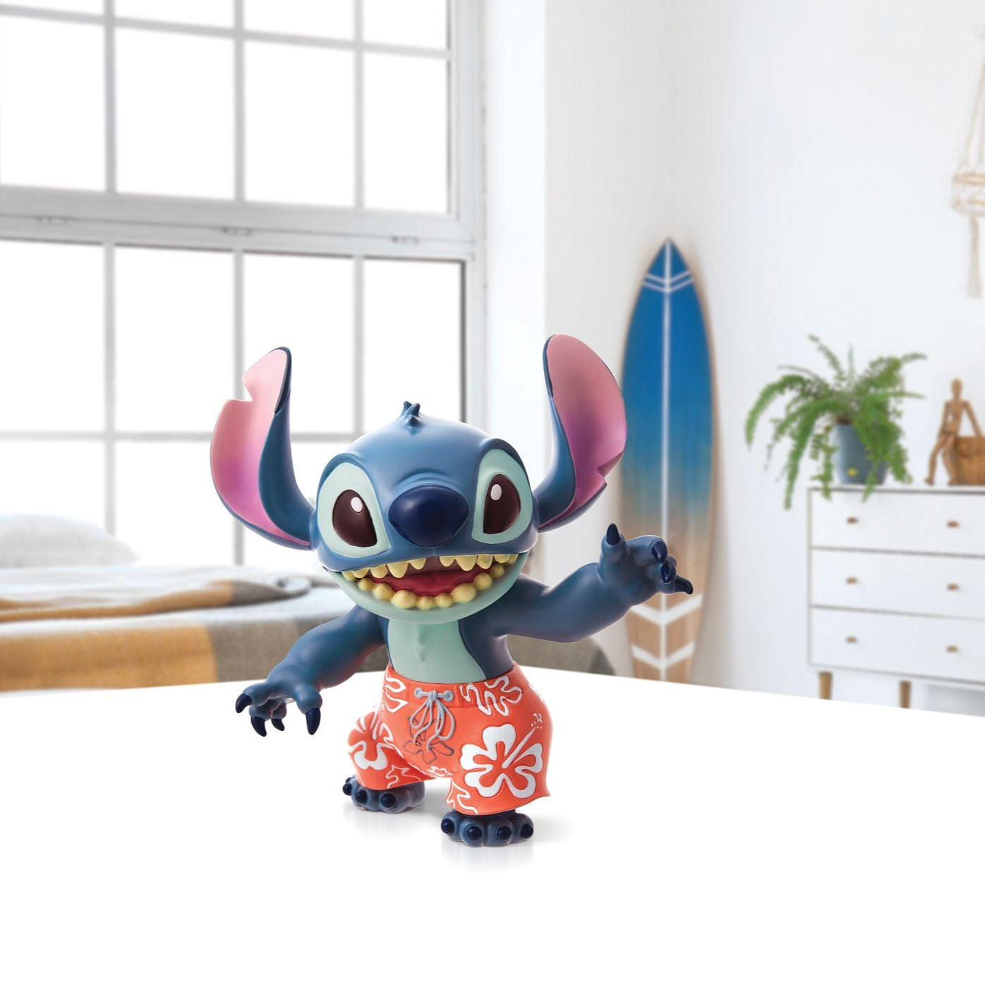 ハイビスカス柄のサーフパンツを身に着け、波乗りポーズでご機嫌なスティッチ。